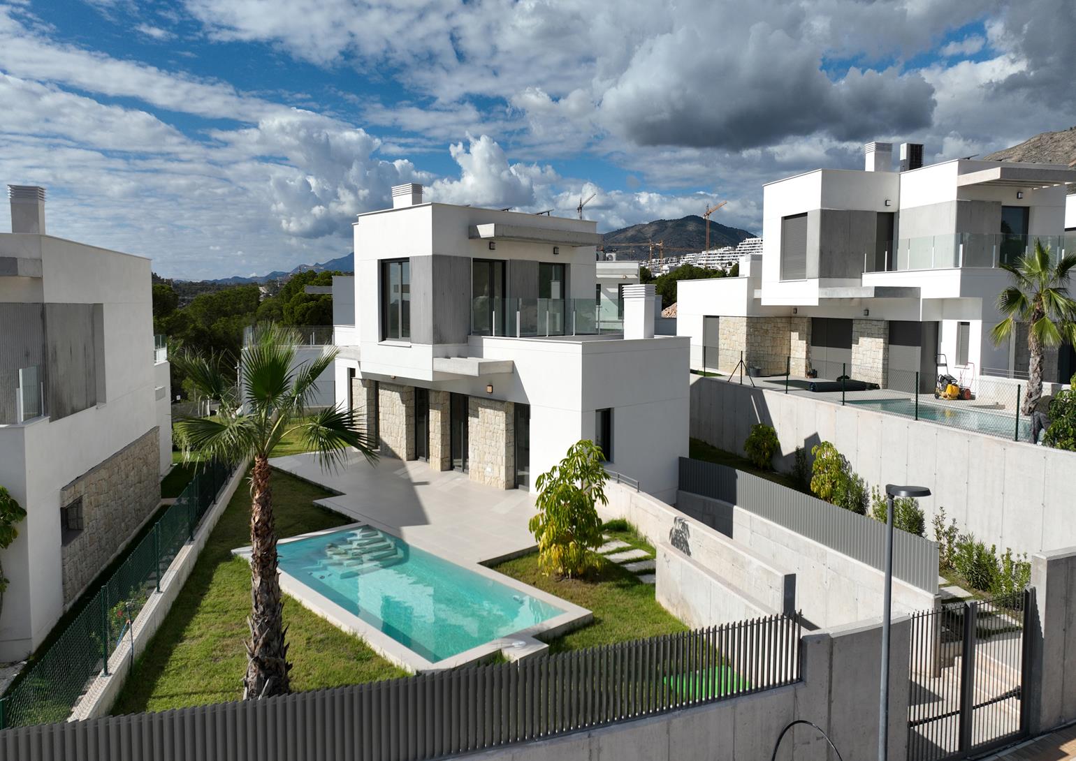 This new villa is key ready and located in Finestrat. It boasts a private swimming pool and is situated on a private plot of 547m2. The villa has a built area of 244m2, with a house area of 204m2. The living room area is a spacious 41m2, and there is also a terrace of 21m2. The villa also includes a basement area of 41m2. The property has 3 bedrooms, 3 bathrooms, and a guest toilet. The villa is conveniently located with restaurants and shops within walking distance. The beach is a short 7-minute drive away, and the port is just 15 minutes away. Bars and restaurants are only 2 minutes away, and shops are a mere 5-minute drive. The airport and medical center are 40 and 10 minutes away respectively. The villa comes with optic fiber internet connection and a closed garage for parking and storage. Air conditioning is available throughout the villa, and the kitchen is a luxury type with some appliances included. The villa also has a garden.